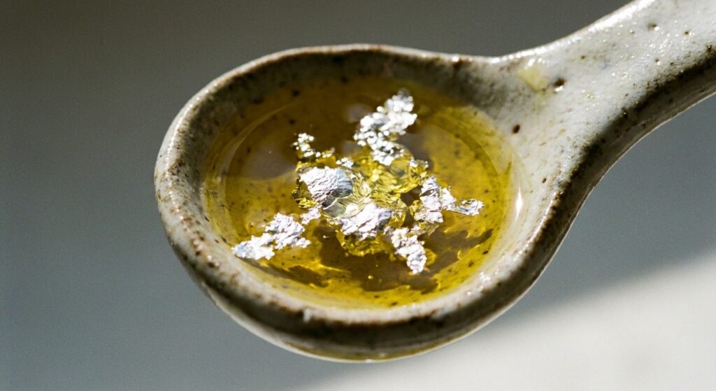 L’huile d’olive argent est le plus souvent une extra-vierge haut de gamme enrichie d’argent comestible ou présentée de façon particulièrement raffinée. Elle se distingue par un profil fruité et doux, des notes métalliques très discrètes et une texture soyeuse qui en fait une huile de finition idéale. Comme toute excellente extra-vierge, elle offre une belle intensité aromatique, reste stable jusqu’à 190 – 220 °C environ et a le pouvoir de rehausser les saveurs, surtout lorsqu’elle est utilisée crue ou en fin de cuisson. Mieux vaut donc la réserver à des préparations où elle sera clairement perceptible : des cuissons violentes ou des assaisonnements trop épicés masqueraient son charme.