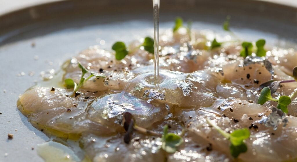 Un carpaccio de dorade ou de bar, composé de tranches très fines, d’un soupçon de fleur de sel, de poivre et éventuellement de zestes d’agrumes, devient somptueux quand on ajoute un filet d’huile d’olive argent juste avant le service. Dans un ceviche, son rôle est d’arrondir l’acidité du citron ou de la lime : après la courte marinade, versez quelques gouttes d’huile pour un résultat méditerranéen et élégant, sans noyer le poisson.